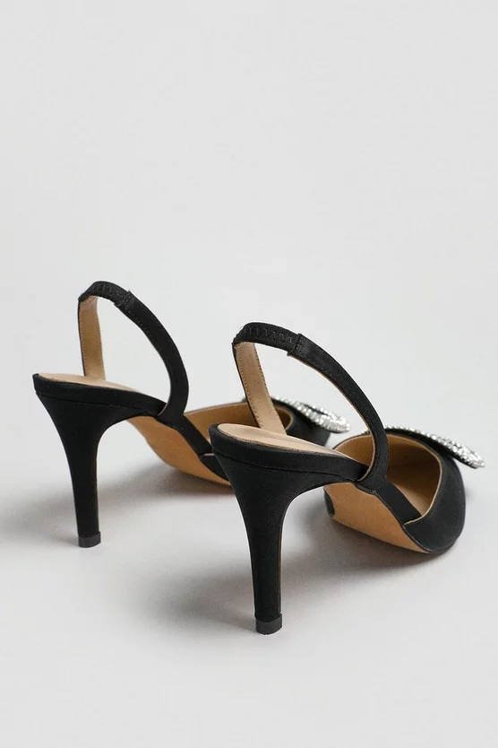 The shoe of your dreams, this sumptuous satin sling-back shows off a mid-height heel and beautiful crystal-buckled toe. Perfect for elevating partywear in seconds, this pretty pair will go straight to the top of your footwear wishlist.