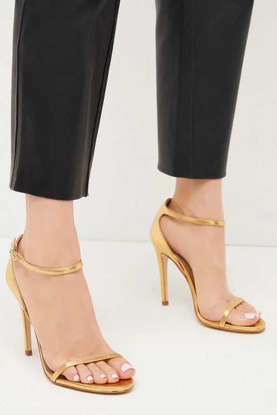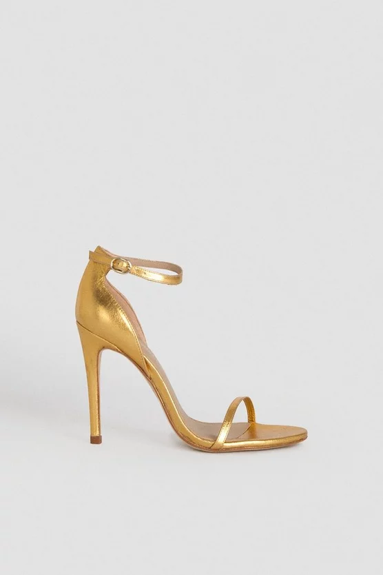 Polish any look with a dash of glamour this summer. Made from shimmering metallic leather, these low-cut strappy sandals punctuate daring party outfits beautifully and feature slender straps, open toes and slim stiletto heels sure to take any look to bold new heights.