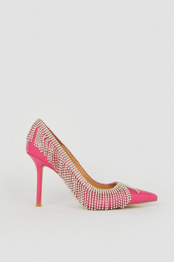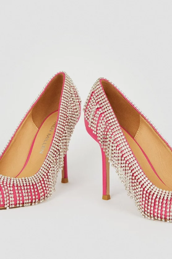 Crafted with premium Brazilian leather and adorned with crystal fringing, these heels are truly decadent. Style these with our matching diamante fringe bag and extravagant drop earrings for a showstopping ensemble.
