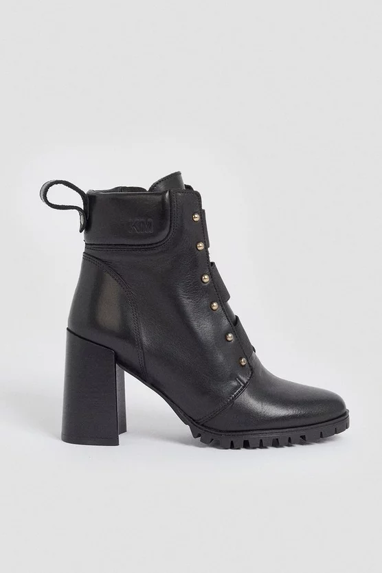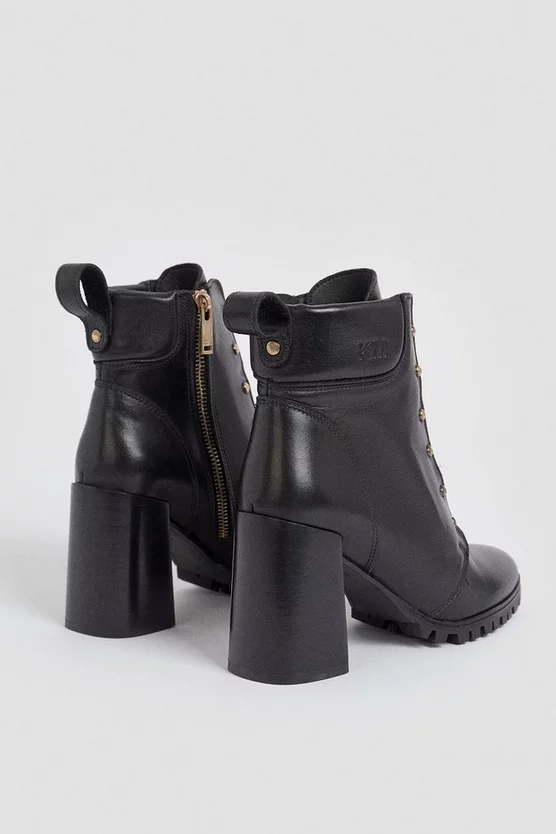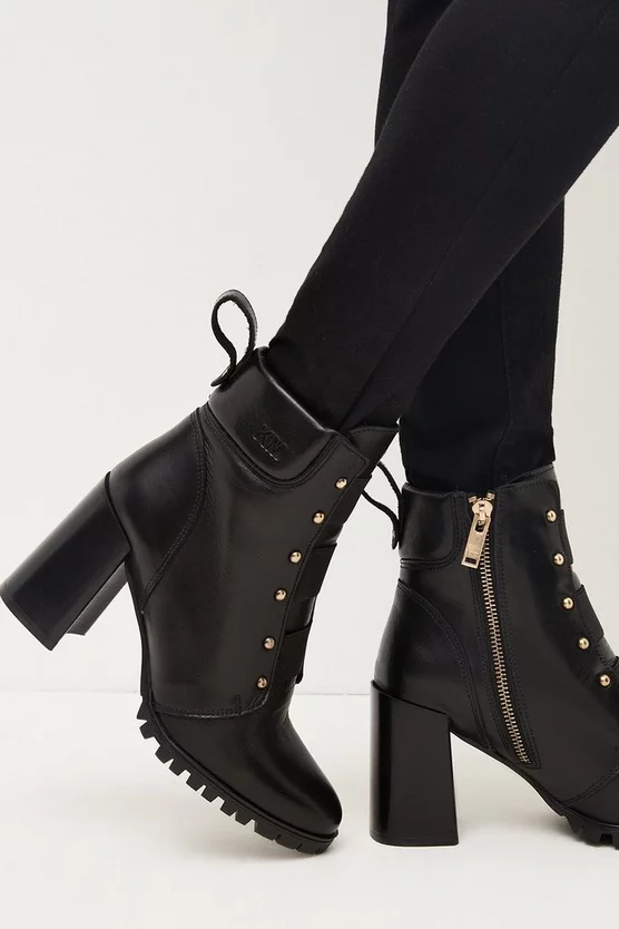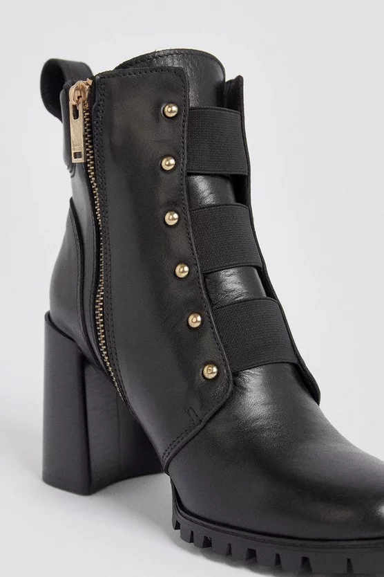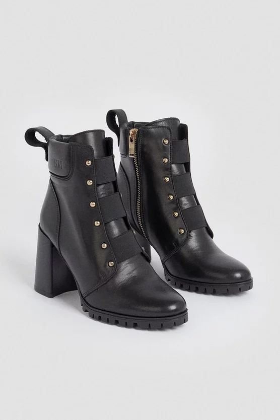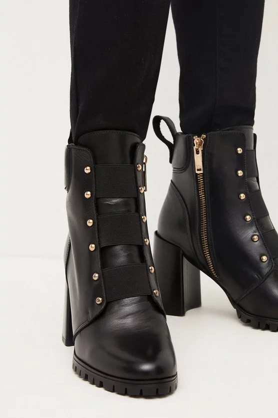 Look ahead to autumn adventures. These butter-soft black leather ankle boots blend hiker-style elastic straps with glossy gold studs and chunky tractor soles. Finished off with block heels and side zip closures, they make the perfect polished choice for workdays and weekend dates too.