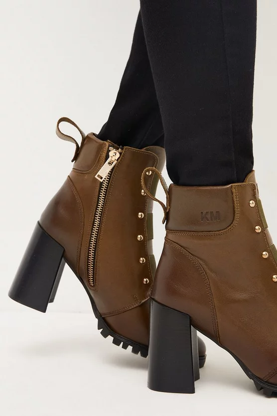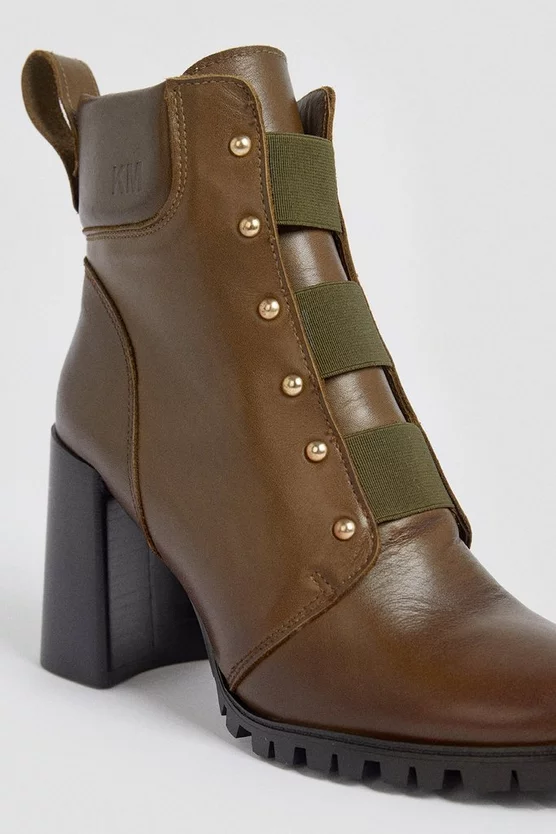 Look ahead to autumn adventures. These butter-soft leather ankle boots blend hiker-style elastic straps with glossy gold studs and chunky tractor soles. Finished off with block heels and side zip closures, they make the perfect polished choice for workdays and weekend dates too.