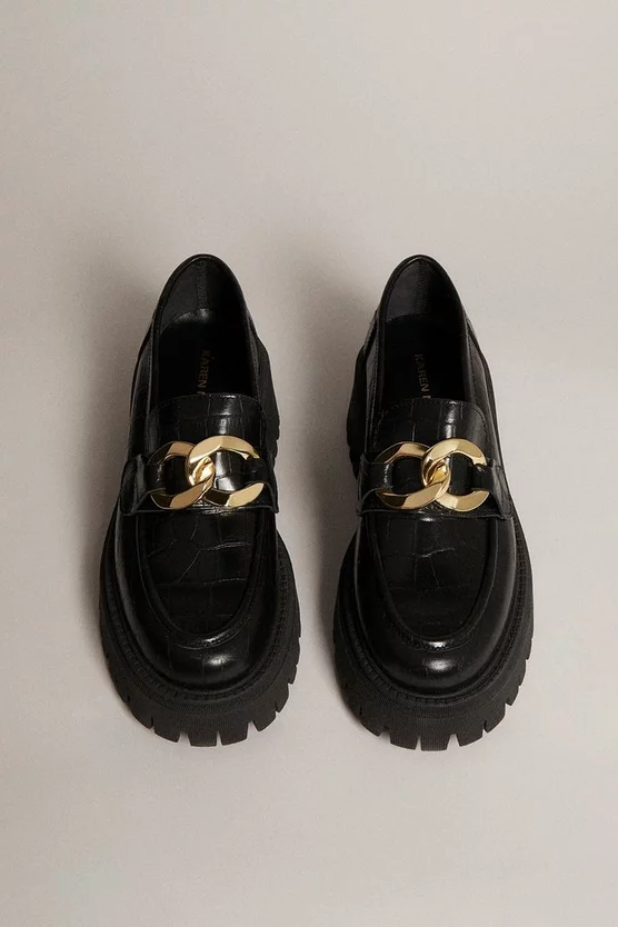 Borrow from the catwalk in these directional leather loafers. Stacked high on chunky soles, they elevate any ensemble with ease and show off gleaming gold-tone hardware, round toes and crocodile-embossed leather for a touch of texture.