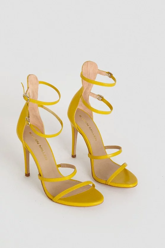 Elevate summer party looks in seconds with these strappy leather heels. Showing off four slender straps and silver-toned buckles, this round-toed pair effortlessly elongate legs and add a dose of vibrant edge to any look.