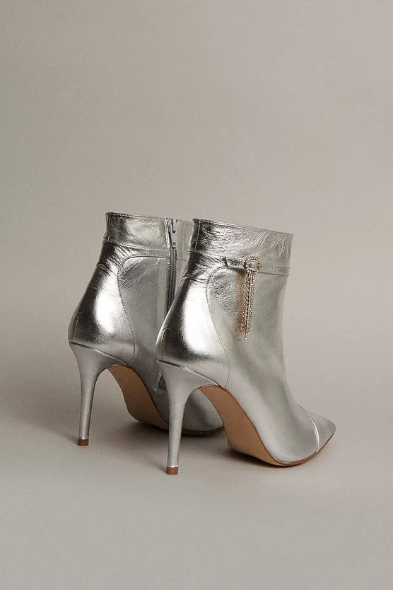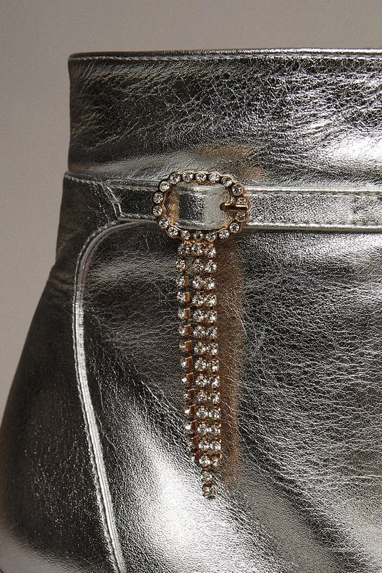 Show your footwear collection some love with these head-turning metallic boots. Crafted from premium Spanish leather with a molten metallic finish, they feature sparkling crystal buckles, pointed toes and stiletto heels for maximum impact.