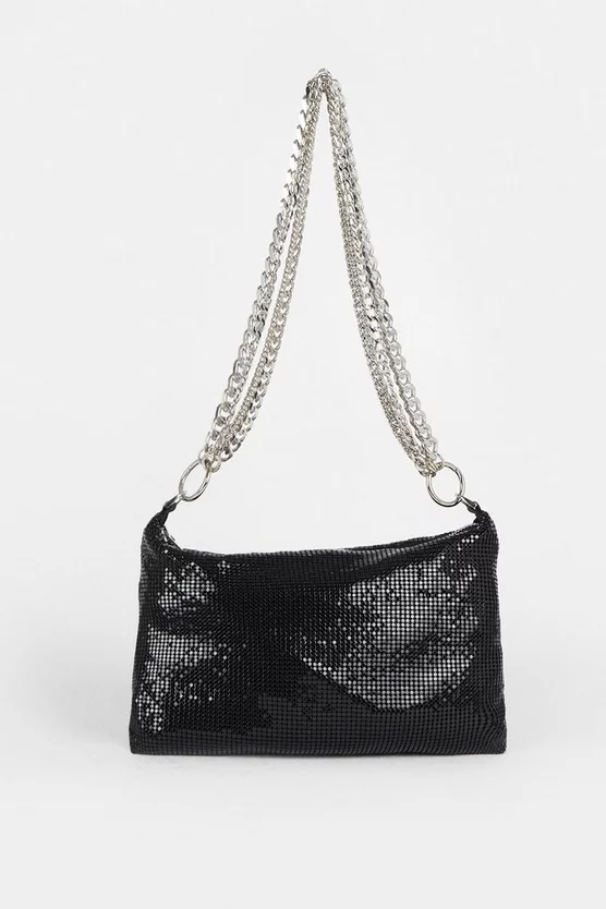 Outer: 100% Aluminium, Lining: 100% Polyester. Bag: H:19cm x W: 27.5cm x D: 1.5cm. Strap length: 55cm.