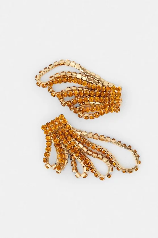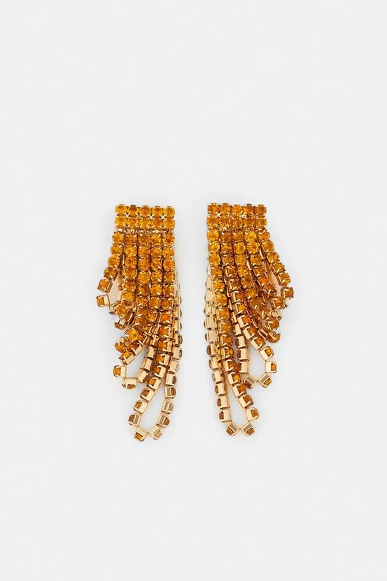 Let your jewellery do the talking. These crystal-embellished drop earrings feature sparkling strands that frame the lobes for an endlessly luxurious feel and swish pleasingly with every step. Perfect for adding a touch of Art Deco allure to understated separates or dramatic silk slip dresses, they look best worn with slicked-back hair to let the unique shape take centre stage.